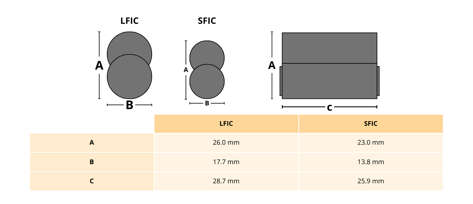 Existen dos tipos de formatos o tamaños dentro de los cilindros intercambiables. Los Cilindros Cortos de Corazón Intercambiable (SFIC por sus siglas en inglés) y los Cilindros Grandes de Corazón Intercambiable (LFIC por sus siglas en inglés).