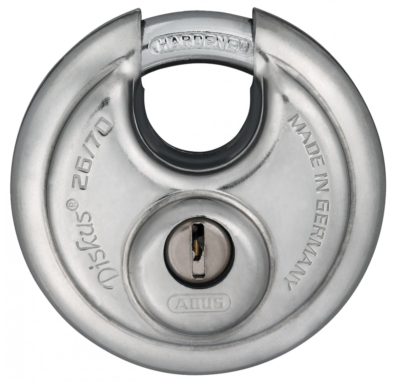 Nuestro candado Diskus® 26 consta de un cuerpo de acero macizo. La maciza estructura interior ofrece aún más seguridad. El cilindro está protegido contra los intentos de taladrado y de extracción. La soldadura, que mantiene unidas las dos cubiertas de acero inoxidable, está soldada a mano en el Diskus® 26. Esto significa que las dos mitades no se pueden separar fácilmente y que el Diskus® 26 protege muy bien sus objetos de valor. Más protección contra forzamientos = ¡más seguridad!