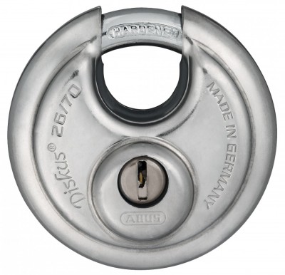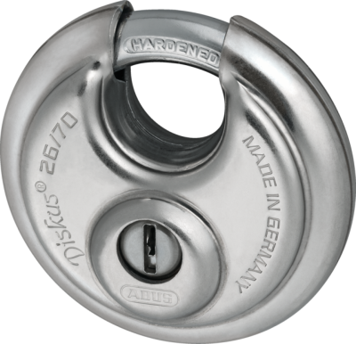 Nuestro Diskus® 26 es un candado extremadamente robusto para asegurar camiones, furgonetas, puertas de sótanos y puertas de fábricas.