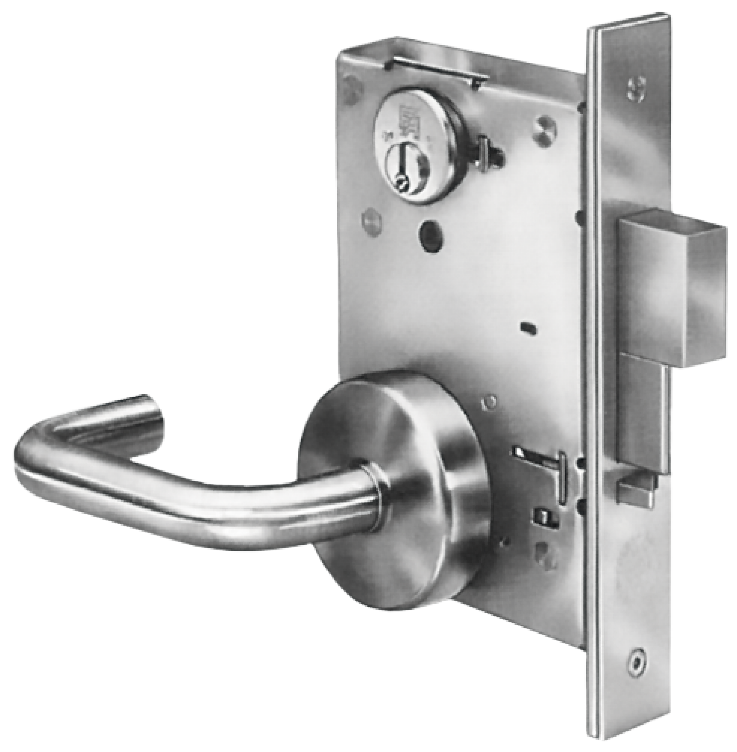 Una cerradura extra resistente para usar en puertas abatibles para usar en celdas de mínima seguridad o áreas públicas de fácil detención.