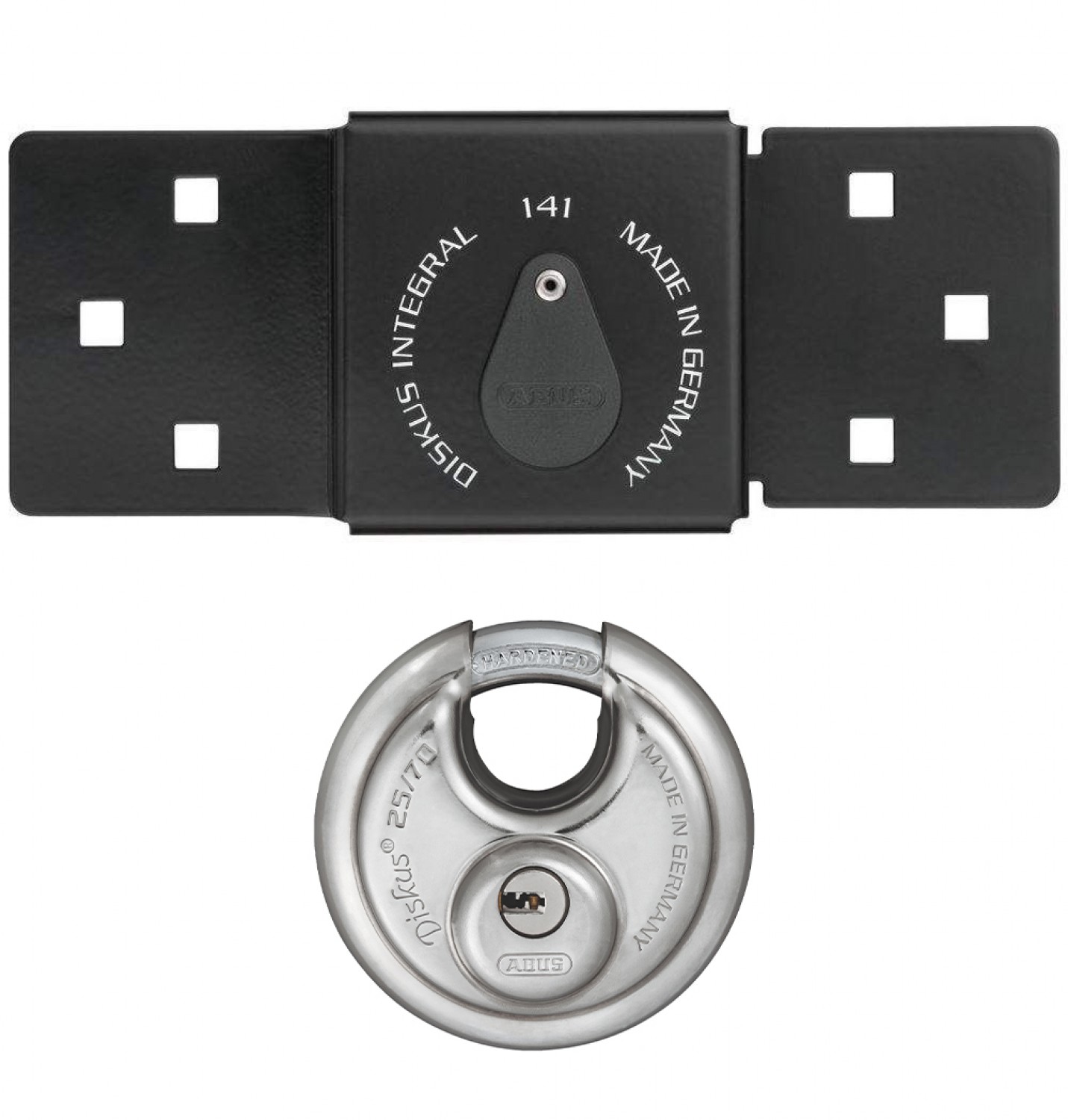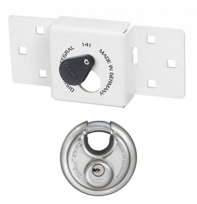 - Porta Candados universal con candado Diskus integrado para puertas abatibles.